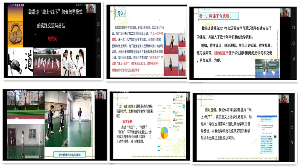 胡秀英老师分享了跆拳道“线上+线下”融合教学模式的实践交流与总结。胡老师从线上教学的背景、设计思路、学情分析,平台选取、重视和加强过程化学习和监控考核、课堂信息化教学手段方法的运用、师生有效实时互动交流、教学内容安排循序渐进、课程思政的引导等方面进行了深入的问题剖析和经验分享。