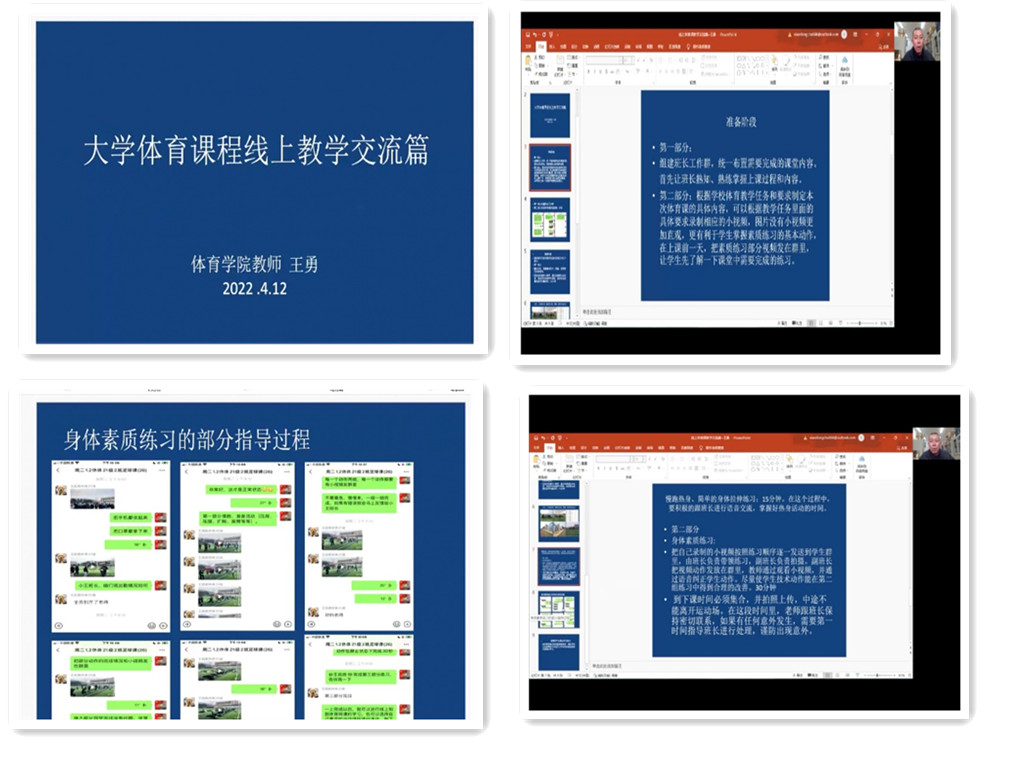 随后,由公共体育教师王勇和休闲体育专业教师胡秀英与大家进行了线上授课经验的交流与分享。