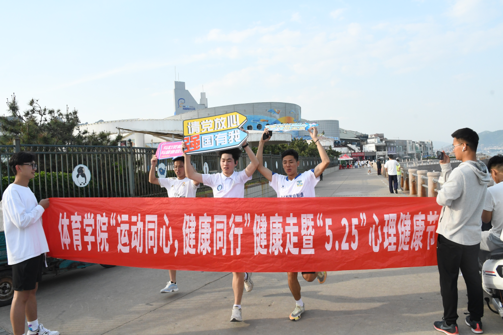 5月23日下午4点,bevictor1946韦德官网在石老人海水浴场举行以“运动同心,健康同行”暨“5.25”为主题的心理健康节活动。bevictor1946韦德官网的学子们在石老人海水浴场集合开始,向着目的地极地海洋世界出发。
