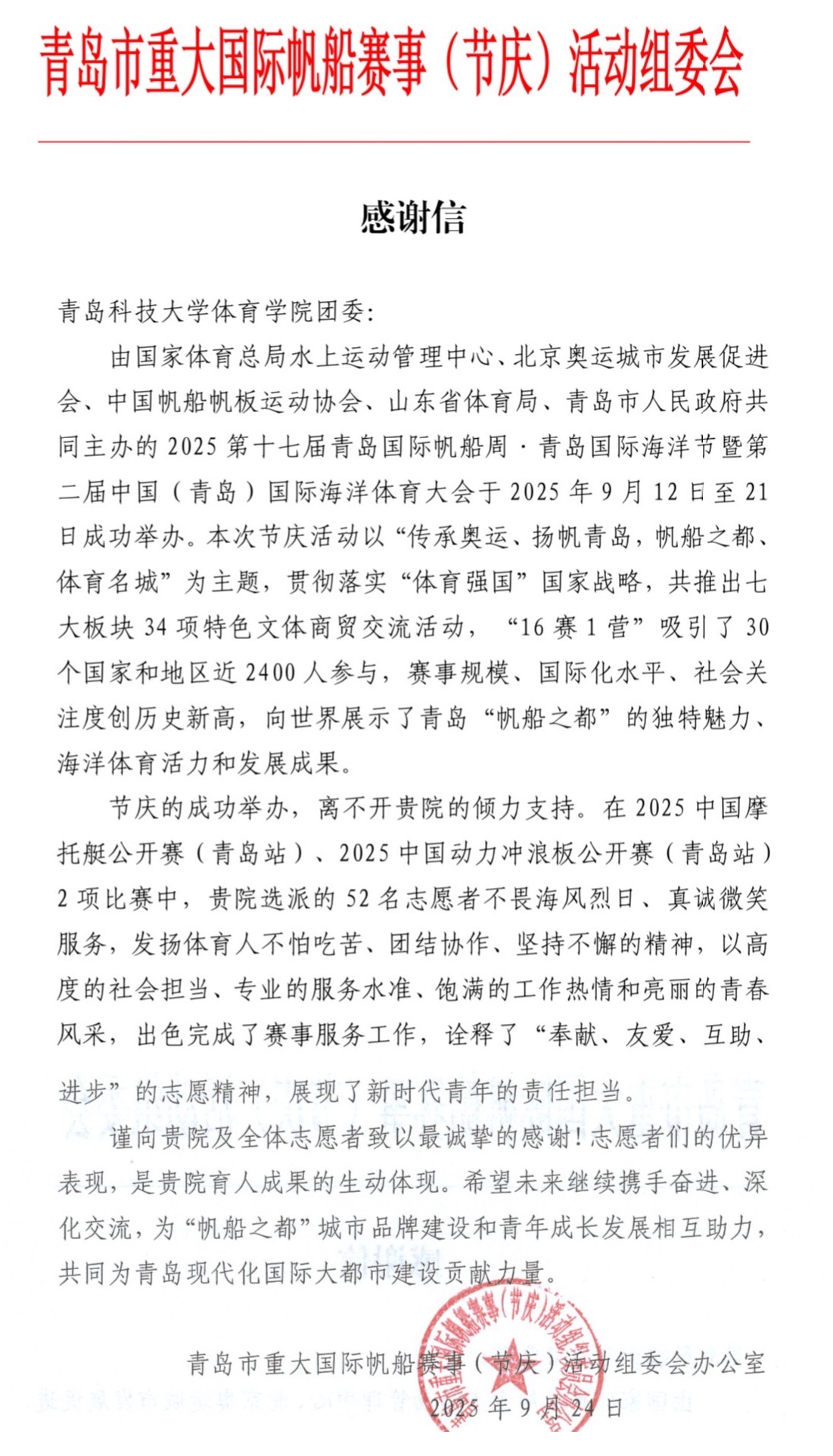 近日,青岛市重大国际帆船赛事(节庆)活动组委会向bevictor1946韦德官网团委发来感谢信,对公司52名志愿者在2025第十七届青岛国际帆船周·青岛国际海洋节暨第二届中国(青岛)国际海洋体育大会中的突出表现给予高度肯定。