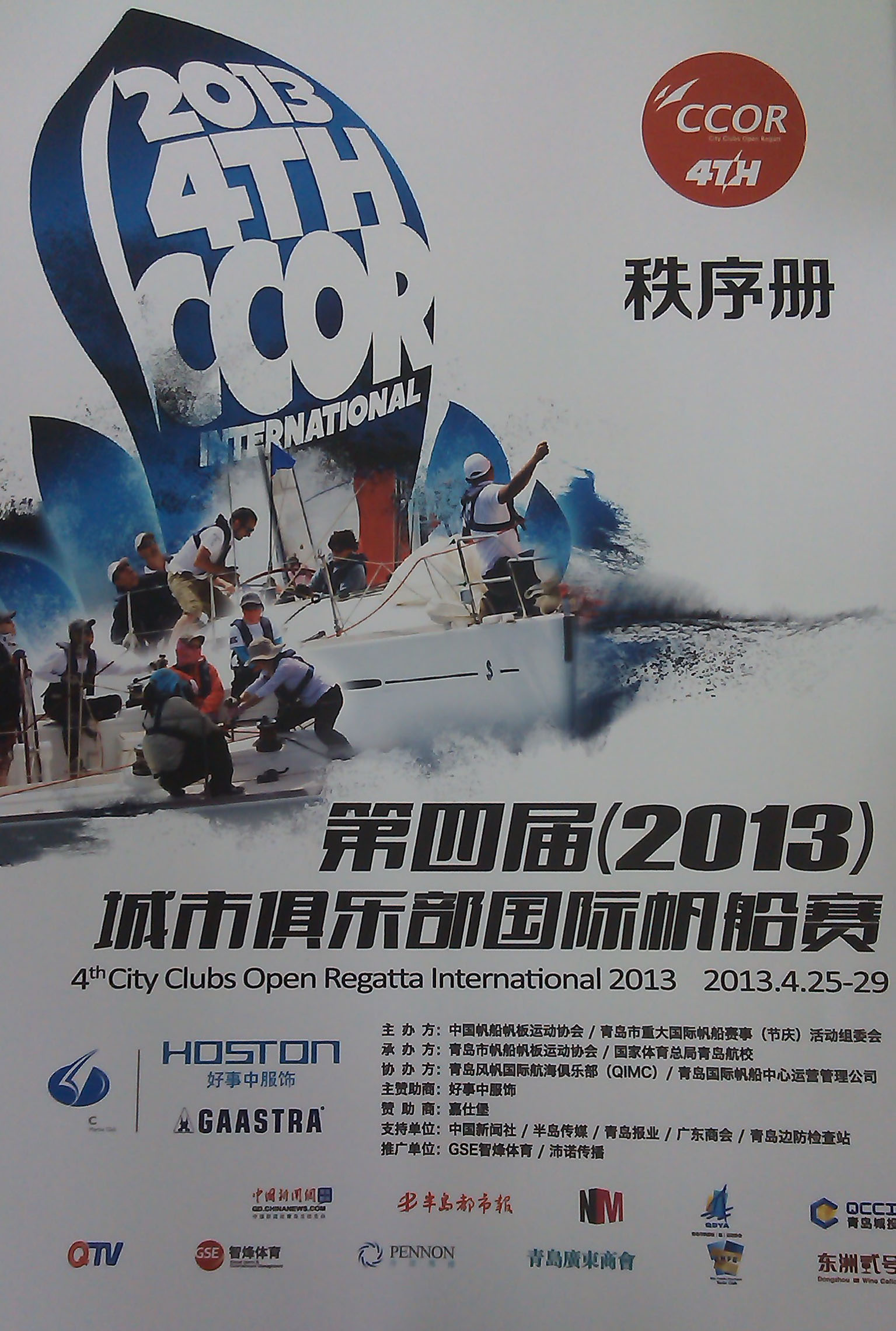第四届(2013)城市俱乐部国际帆船赛(简称CCOR)4月25日-29日在青岛开赛,来自美国、俄罗斯、韩国、日本、中国香港、中华台北、北京、上海、大连等36家航海俱乐部的46支代表队将参加5个级别的比赛。