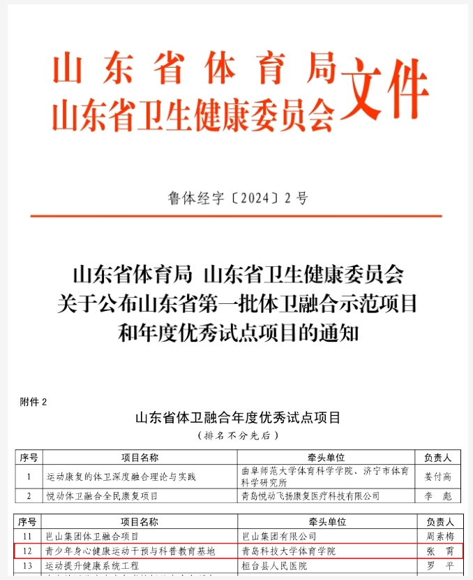 近期,根据《山东省体育局山东省卫生健康委员会关于开展第一批体卫融合示范项目和2022年度优秀试点项目评选的通知》(鲁体办字〔2023〕28号)要求,经单位推荐、实地调研、专家评选、社会公示等环节,公司bevictor1946韦德官网申报的《青少年身心健康运动干预与科普教育基地》获体卫融合年度优秀试点项目。